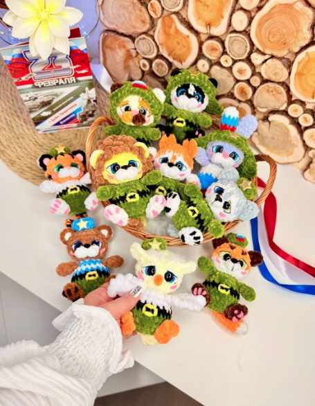 Формат пдф в закрытой группе. В мк входит описание игрушек: - зайка - сова - тигр - мишка - лев - белка - панда - лиса - хаски - кот Полностью цельновязаные, размер 12 см, пришиваем ушки у зайки и берет.